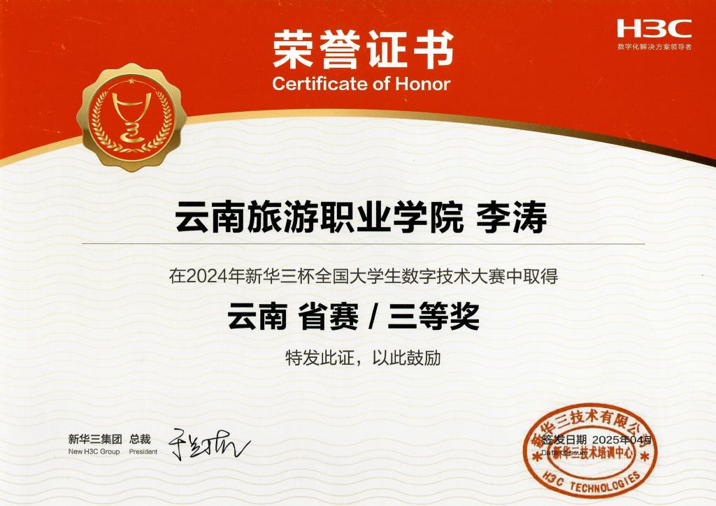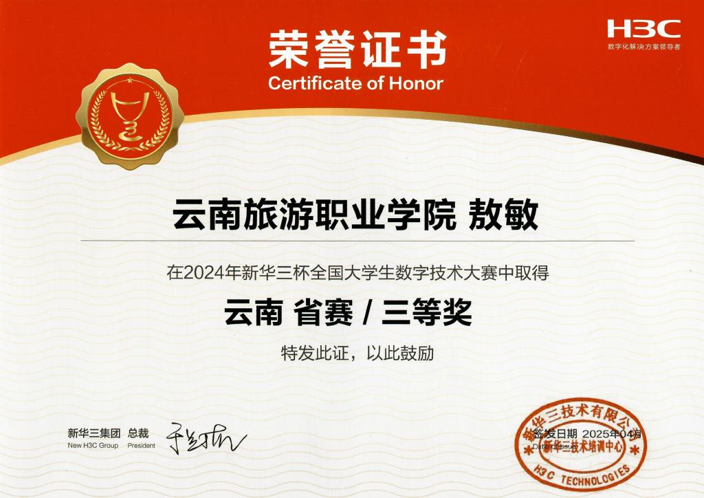 2024年“新华三杯”全国大学生数字技术大赛云南省赛区获奖名单于近日揭晓,我校信息工程学院敖敏、李涛两名同学斩获云南省赛三等奖。