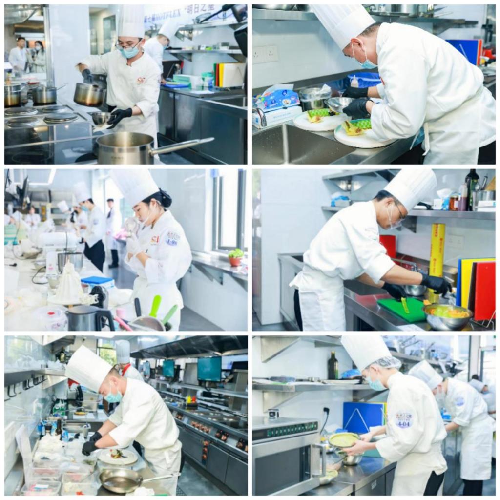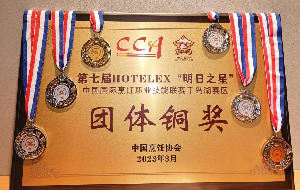 我院共有6名师生代表参赛,经过近半年的辛勤努力,精心准备,研读参赛规程,苦练专业技能,在比赛中顶住压力,现场稳定发挥,赛出了我院师生的风格和水平。经过团队奋力拼搏,学院获得团体铜奖,最终喜获个人1金4银1铜的佳绩。其中,杜朝旺老师荣获西式热菜金奖,郑泽香同学荣获西式面点银奖,赵明彦、张庭耀两位同学荣获西式冷菜银奖,尹永相同学荣获西式热菜银奖,郭钰肖同学荣获西式热菜铜奖。