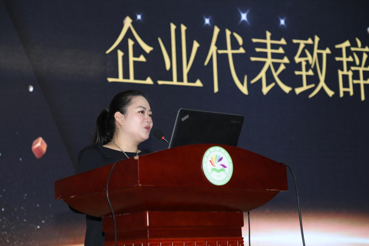云南广飞餐饮管理有限公司副总裁王莉在代表企业进行致辞,她详细介绍了公司的发展历史、企业文化和餐饮规模等内容,并对烹饪学院的长期合作与信任表示了感谢。她指出,课程进企业是一种双赢模式,有利于促进行业、企业参与职业教育人才培养全过程,希望未来能与烹饪学院走出一条融合、创新、共享的合作发展之路。
