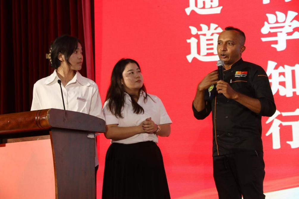 在认识学院教师时,学院邀请了来自斯里兰卡的外籍教师苏明达与学生进行互动交流。韩昕葵院长还通过幻灯片对学院所有教师进行了一一介绍,充分展示了我院师资队伍的雄厚实力和优秀风采。