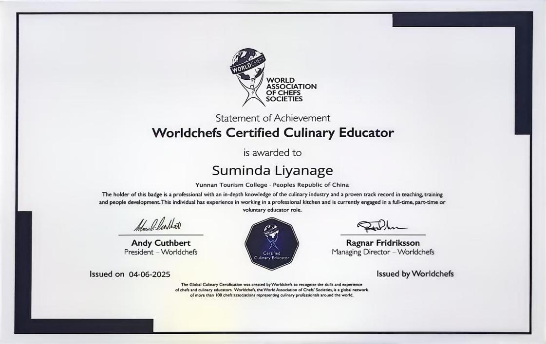 近日,我校烹饪学院传来喜讯,斯里兰卡籍外教苏明达老师荣获世界厨师协会(WorldAssociation of Chefs Societies,简称 WACS)“全球认证”烹饪教育者资质。