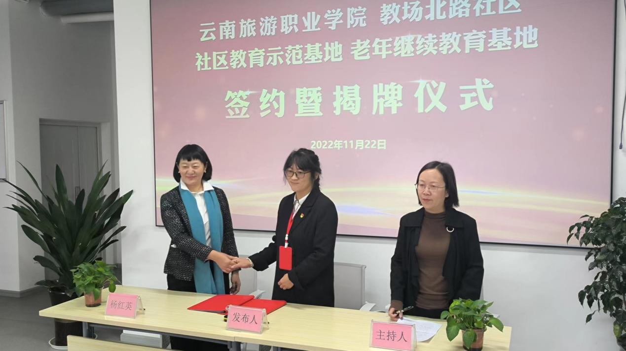 仪式现场,江南官方注册副校长杨红英和教场北路社区党委书记杨晓娟代表双方签署了合作协议,并为社区教育示范基地和老年继续教育基地揭牌。双方充分利用辖区文化教育资源,用文化教育浸润人心,探索出一条以文化建设助推社会治理创新的新路径。