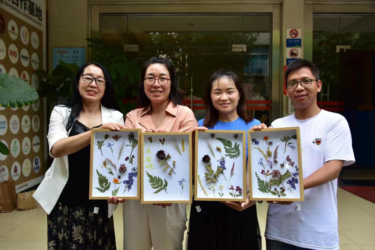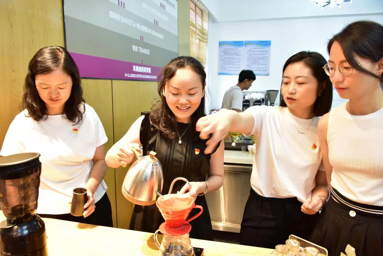 党课之后,所有参会党员来到实训室分项参加技能实践活动,包括干花相框制作、咖啡冲泡和非遗扎染制作。