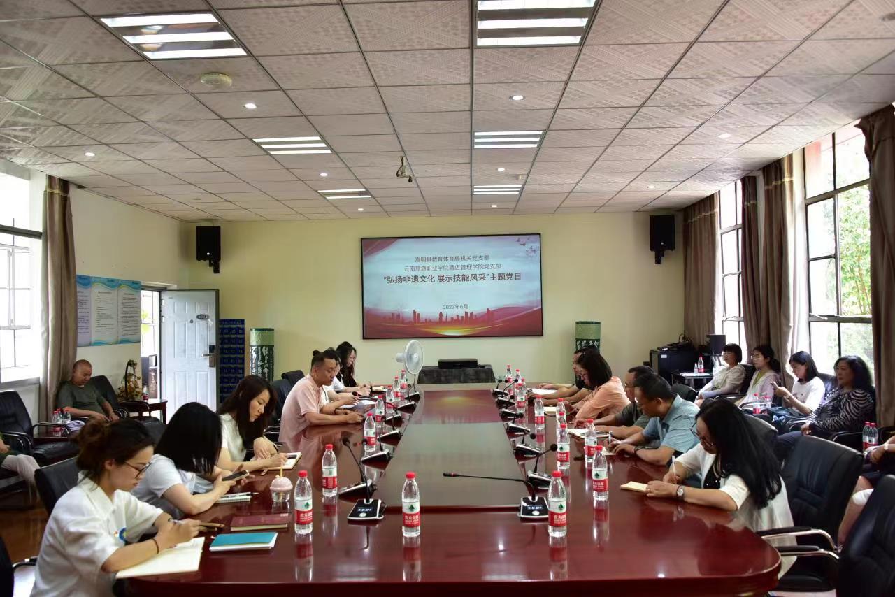 为深入学习贯彻党的二十大精神和进一步学习贯彻习近平新时代中国特色社会主义思想主题教育,弘扬非遗文化,引领全体党员干部职工思想,凝聚党支部战斗力量,2023年6月2日,酒店管理学院党支部和嵩明县教育体育局机关党支部联合在酒店实训楼开展了以“弘扬非遗文化展示技能风采”为主题的党日活动。嵩明县教育体育局机关党支部的20名党员和酒店管理学院全体党员参加本次活动。