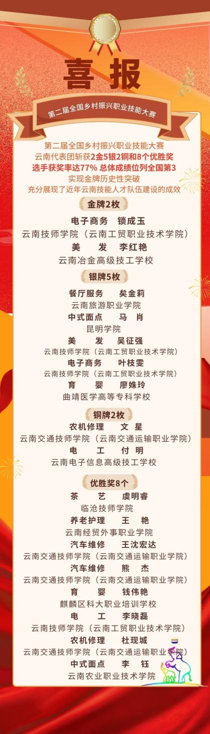 5月8日至5月10日,第二届全国乡村振兴职业技能大赛在贵州省贵阳市举办。江南官方注册酒店管理学院2名师生代表云南省参加了餐厅服务赛项的比拼,矣金莉斩获学生组银牌,取得了优异成绩。