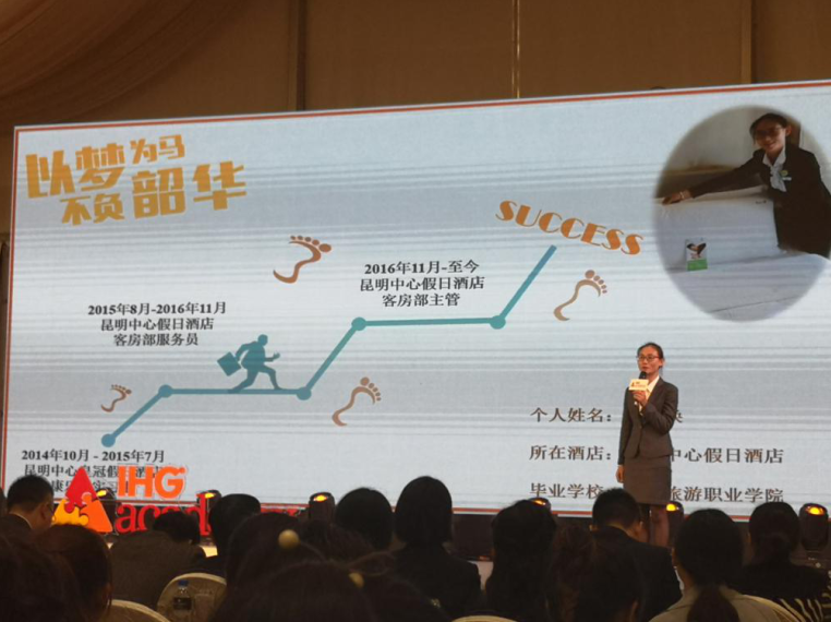 在活动的尾声是几位成长于洲际英才学院的学长学姐讲述自己的学习和实习经历,我校毕业生普金焕(目前任职于昆明中心假日酒店),从实习开始两年内晋升为客房部主管,开启了灿烂的酒店职业生涯,她用自己的亲身经历鼓励着新同学。