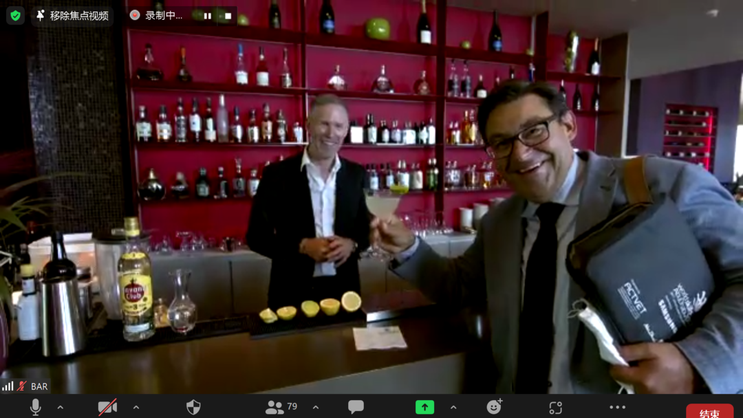 最后,国际著名酒类饮品专家 Patrick Braun先生,为各位老师展示了吧台秀,对整个吧台的准备、各类工具、各种杯子先后进行了演示和讲解,然后调制了六款鸡尾酒。