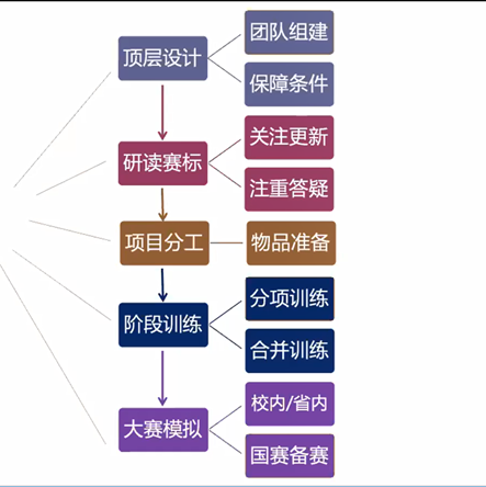杨院长着重强调技能素养通过两赛的融合可以达到更高的维度,由专到精,由单一到复合,由看不见到看得见,由表及里。并且通过一个思维导图,讲解了以赛促教最佳实践的流程,从顶层设计、研读赛标、项目分工、阶段训练、大赛模拟进行了详细的分析。