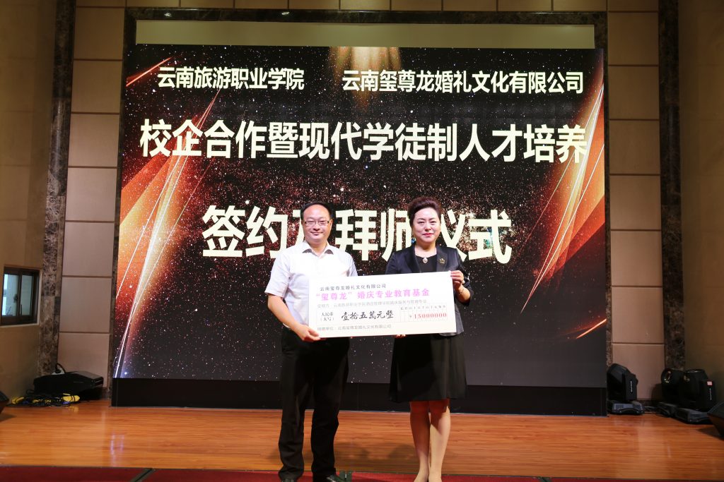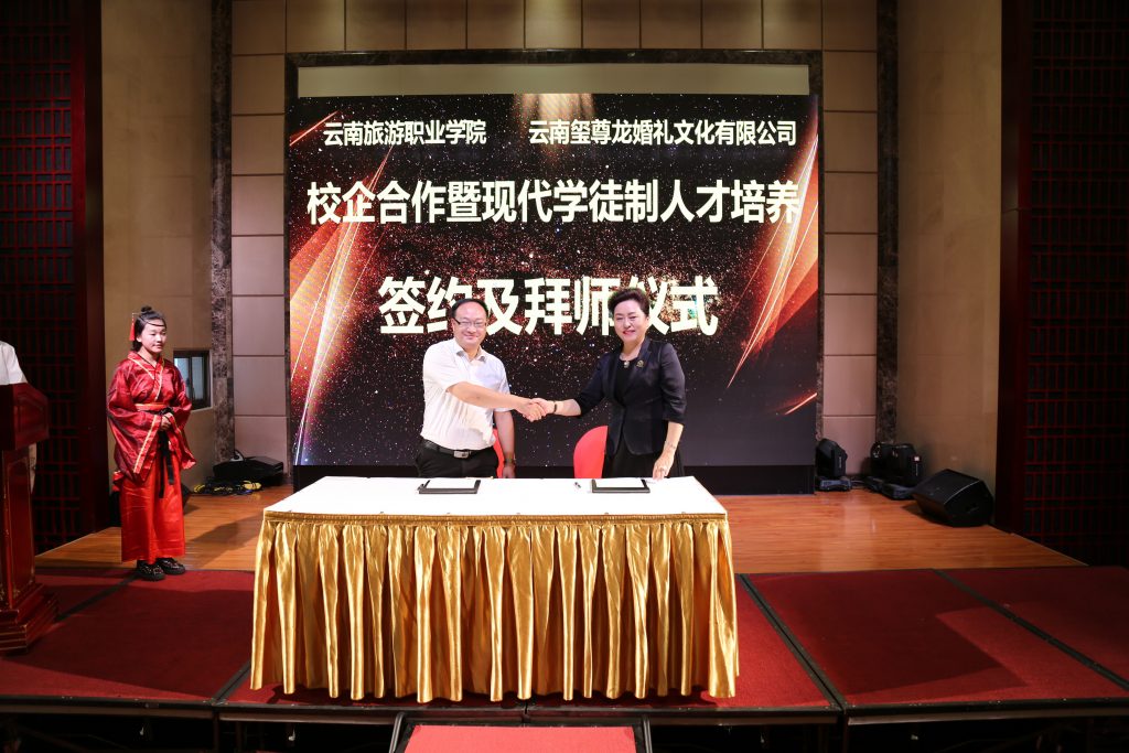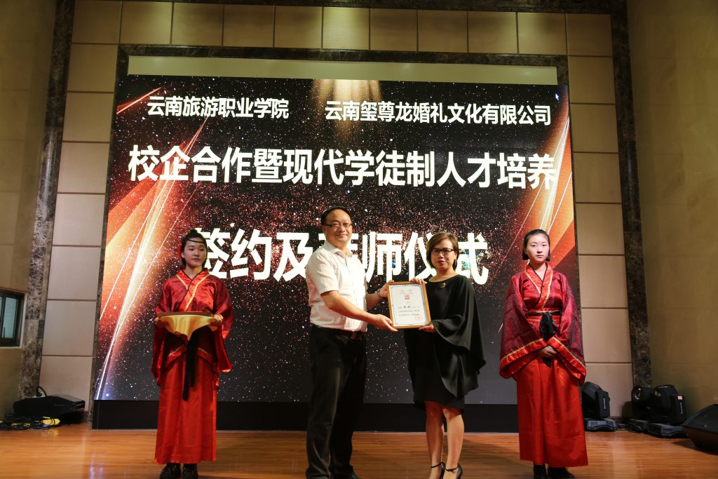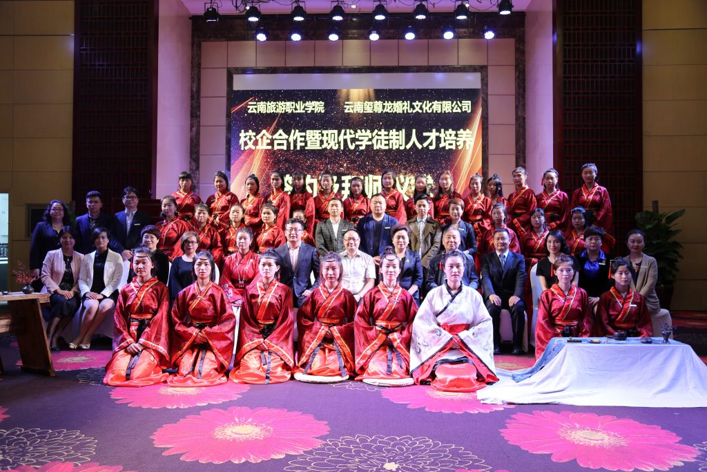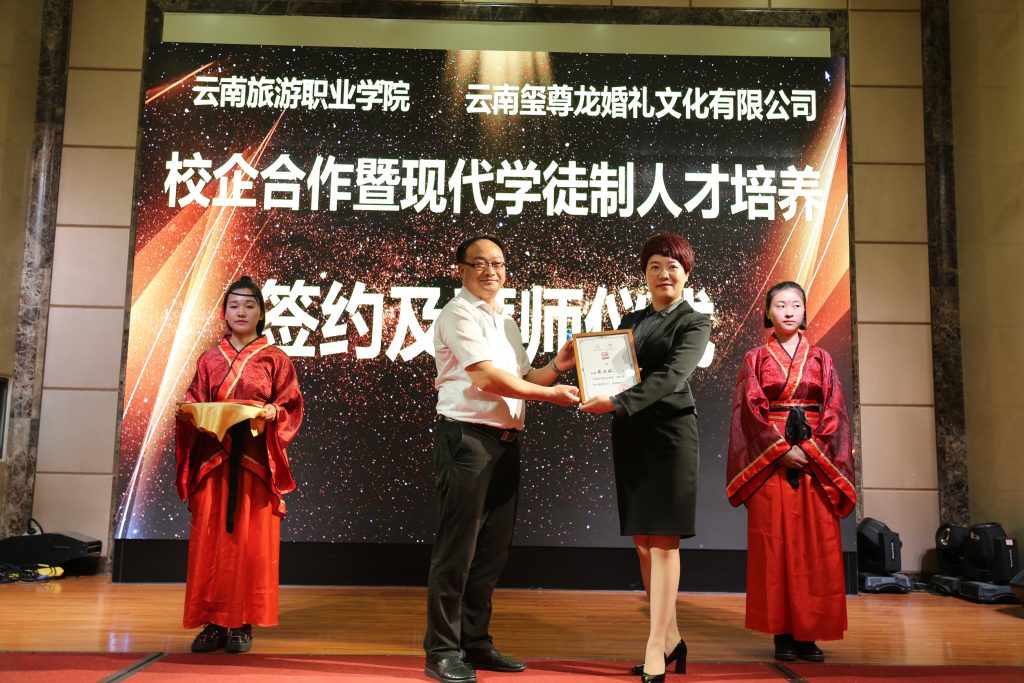 7月5日上午,“江南官方注册·云南玺尊龙婚礼服务有限公司校企合作暨现代学徒制人才培养签约仪式”在玺尊龙婚礼中心隆重举行。云南玺尊龙婚礼文化产业集团董事长、云南省婚庆行业协会会长姜亚碧女士,玺尊龙婚礼中心总经理吴峰先生,温蒂文化传播有限公司执行董事杨妮女士,昆明广播电视台主播云春先生,昆明广播电视台形象工作室总监戴亚丽女士,云南省婚庆行业协会秘书长杨琨先生及其他企业导师,江南官方注册符继红副校长,江南官方注册酒店管理学院院长、云南省婚庆行业协会副会长杨红波副教授,建水文庙国学中心顾问、心香书院院长赵雅婷女士,婚庆服务与管理专业教研室全体教师及2016级“玺尊龙订单班”学生参加了本次签约仪式。