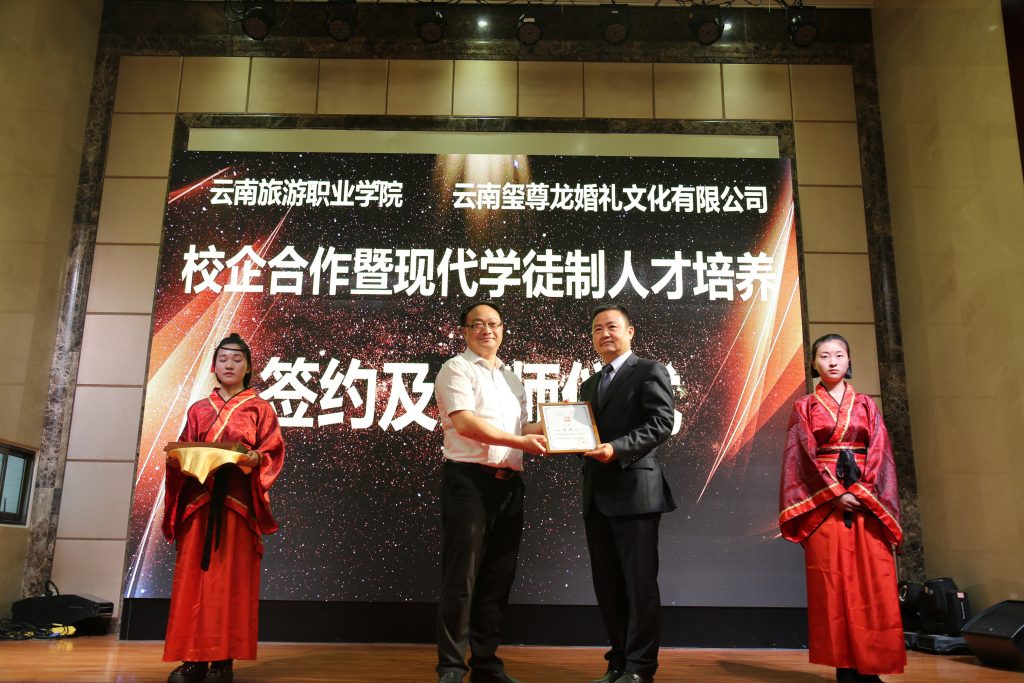 仪式在“玺尊龙订单班”的香道及茶艺表演中开始,姜亚碧会长和符继红副校长分别致辞,并签订了校企合作暨现代学徒制人才培养合作协议。根据协议,企业为校方设立了“玺尊龙教育基金”并捐赠了一批专业书籍,向订单班学员颁发名牌;符继红副校长和杨红波院长向姜亚碧会长等企业专家颁发了客座教授聘书和企业导师名牌。