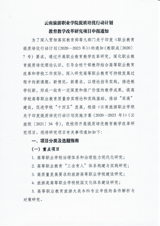 云南省旅游职业学院提质培优行动计划教育教学改革研究项目申报通知