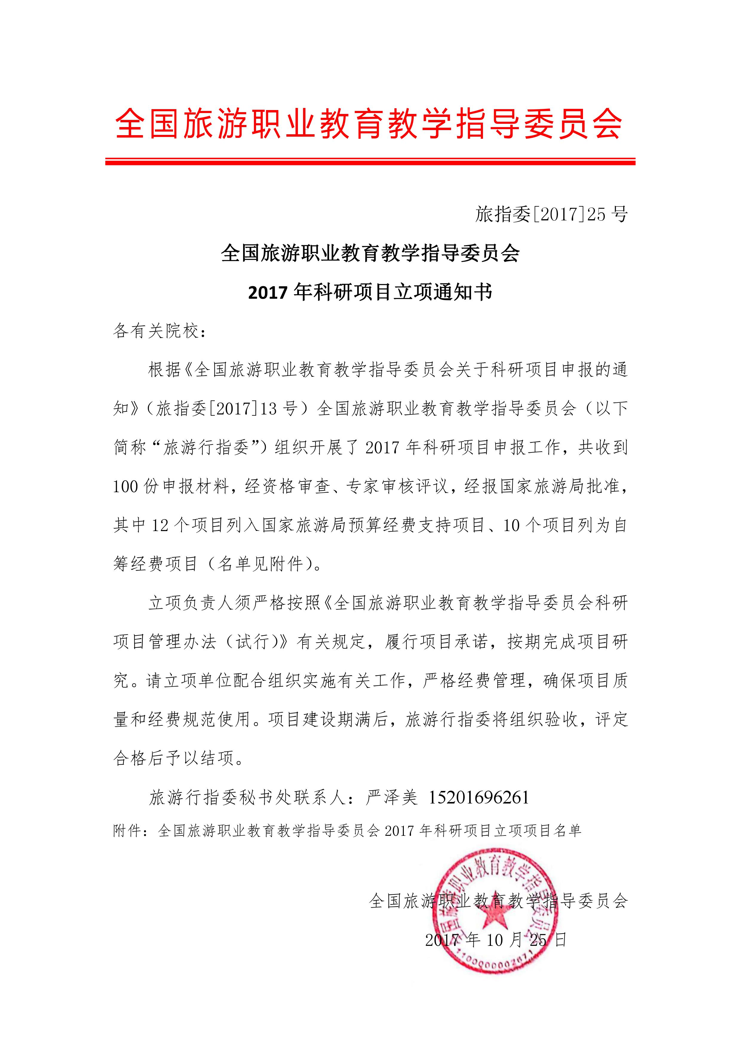 近日,从全国旅游职业教育教学指导委员会获悉,全国旅游职业教育教学指导委员2017年科研项目立项通知书公布,旅游行指委共收到100份申报材料,我院教师利用暑假时间积极申报了14项课题,经行指委评审,报国家旅游局批准,我院邓洁煌老师的课题《基于学生创新创业能力培养的旅游工艺品专业实践体系研究》获得立项,这是我院第一次获得全国旅游职业教育教学指导委员会课题立项,可喜可贺!