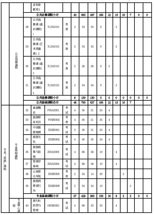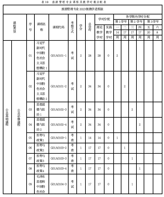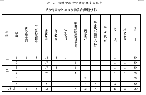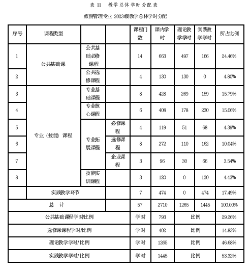 本专业总学时为2710学时,每16学时折算1学分。学年周数40公共基础课程学时总学时29%。实践性教学学时总学时的53%,其中,岗位实习分阶段安排在第五、六学期(第五学期20周,第六学期4周)累计时间为6个月。各类选修课程学时为总学时的15%具体详见表。