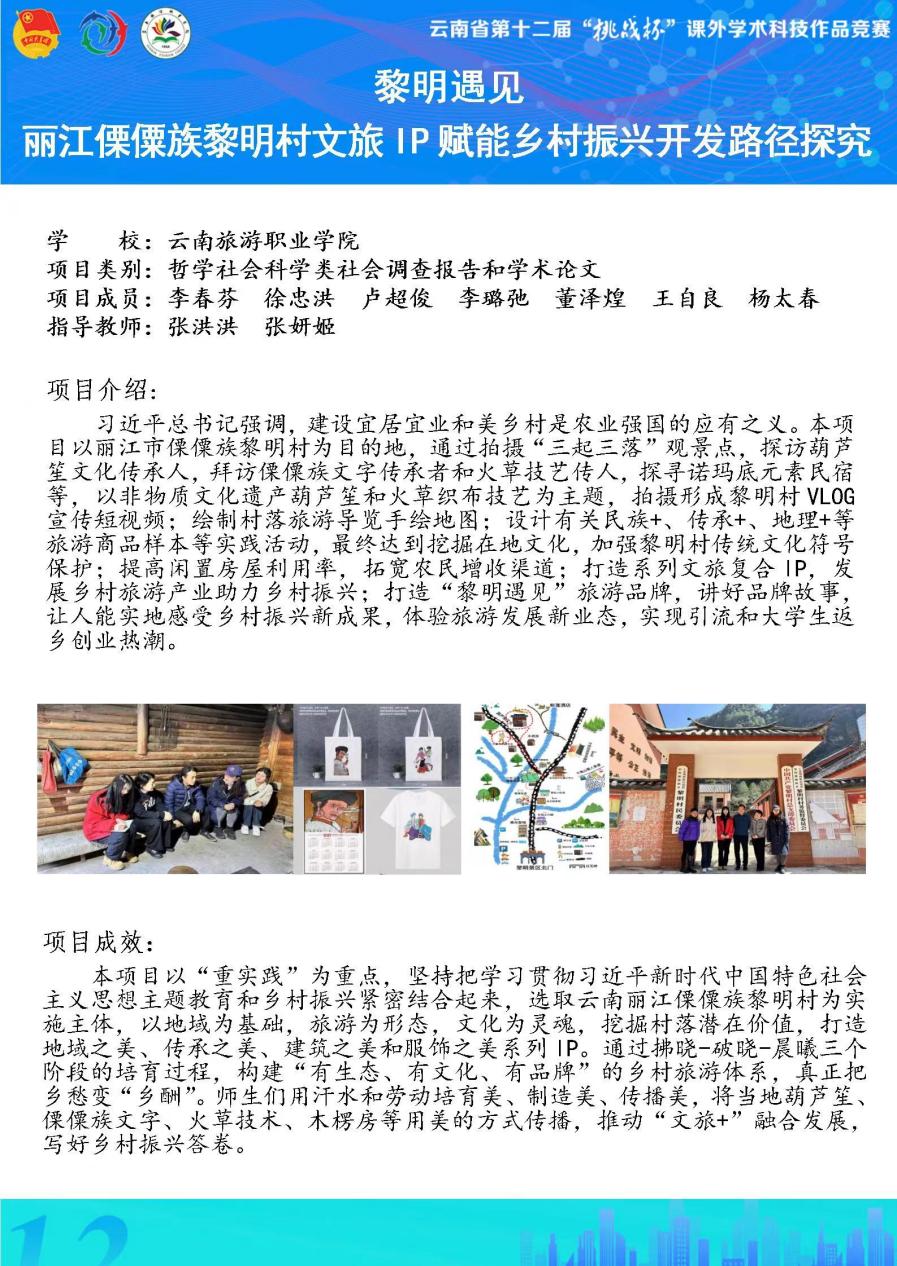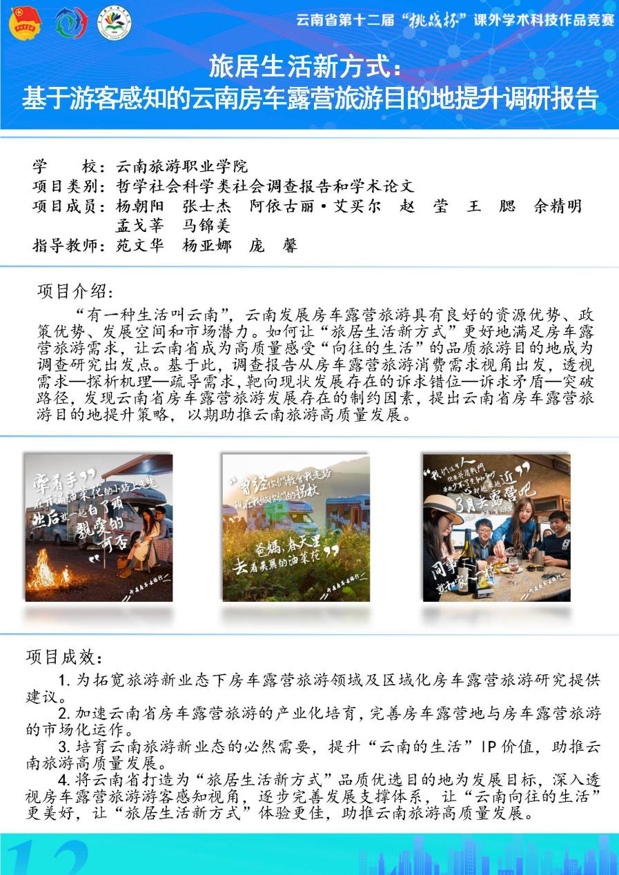 6月6日,云南省第十二届“挑战杯”大学生课外学术科技节在昆明落下帷幕,经过激烈的角逐,我校《黎明遇见——丽江傈僳族黎明村文旅IP赋能乡村振兴开发路径探究》和《旅居生活新方式:基于游客感知的云南房车露营旅游目的地提升调研报告》两项作品斩获省赛特等奖!其它作品获得4项二等奖和9项三等奖的好成绩,首创新突破!