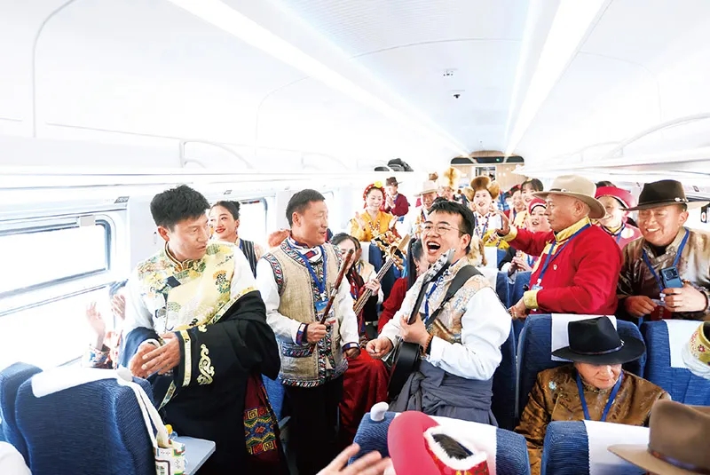 2023年11月26日,云南丽江至香格里拉铁路开通运营,乘坐首发列车的各民族群众代表激动万分,他们载歌载舞,一同欢庆迪庆藏族自治州迈入动车时代。 云南日报 供图