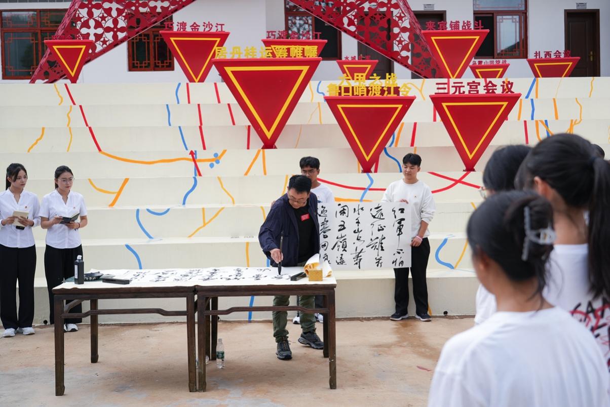 为了进一步弘扬长征精神,我校图书馆馆长于会超老师现场挥毫泼墨,书写了“七律长征诗”和“长征精神 永放光芒”等书法作品。这些作品不仅展现了教师的深厚文化底蕴,也寄托了在场师生对红色文化的深厚感情。