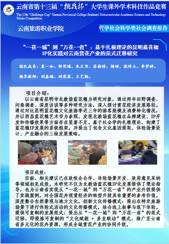 项目名称:“一花一城”到“万花一省”:基于扎根理论的昆明蓝花楹IP化实践对云南赏花产业的范式迁移研究