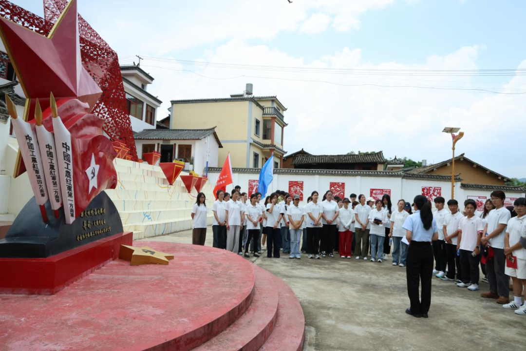 7月15日,师生们一行前往东川区树桔村,开展“重走红军长征路”活动。在五星广场、红军指挥部旧址、火炬雕像前,师生们驻足凝视,仿佛能听到当年红军战士们坚定的脚步声和激昂的口号声。同行的思政课教师还围绕习近平总书记三次考察云南的重要讲话精神,聚焦红军长征过云南的红色故事,为当地村委会干部和师生们带来了一场精彩且生动的宣讲。
