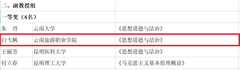 近日,省委教育工委公布了全省高校思想政治理论课教师教学比赛结果,共评出一等奖 19 人、二等奖 31 人、三等奖48 人、优秀奖 114 人,我校马克思主义学院参赛教师在比赛中发挥出色,斩获副教授组一等奖,形势与政策组三等奖,青年教师组优秀奖的佳绩。值得一提的是我校也是此次比赛中唯一一家获得一等奖的高职院校。