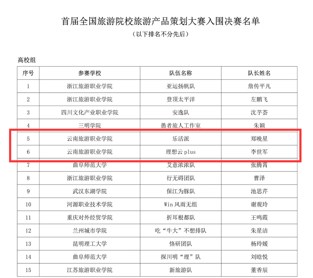 本届大赛以“发展青年匠心,策划精彩旅行”为主题,自2023年8月初启动,得到了全国旅游院校师生的积极热烈响应。共吸引了来自全国316所旅游院校参加,组委会共收到报名作品929份,初筛合格作品903份。经过激烈角逐,高校组15支队伍、中职组10支队伍入围决赛,其中,我校旅游管理学院报送的乐活派、理想云plus两支参赛队伍进入决赛现场,云旅七色光参赛作品喜获初赛优胜奖。