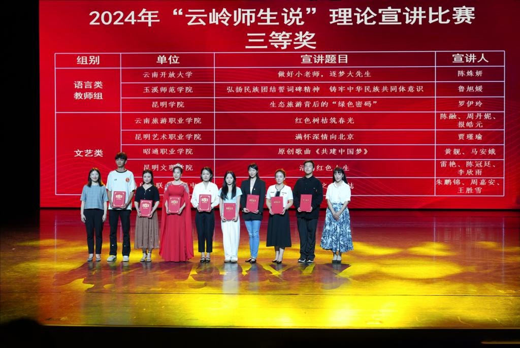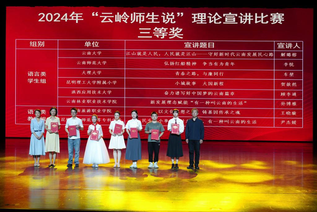 6月13日,由中共云南省委教育工委、云南省教育厅主办,云南艺术学院和我校承办的2024年“云岭师生说”理论宣讲比赛决赛暨观摩活动在云南艺术学院实验剧场圆满落幕。活动旨在以讲促行,将党的声音传遍云岭、让党的理论深入人心,积极投身全面建设社会主义现代化国家新征程。我校师生积极参赛,并在比赛中喜获佳绩。