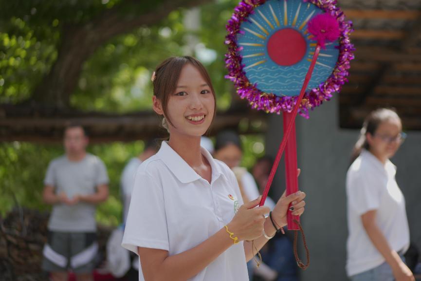 图为“文艺+”暑期社会实践团队成员在同乐村学习交流同乐村非遗文化,与当地村民进行合影