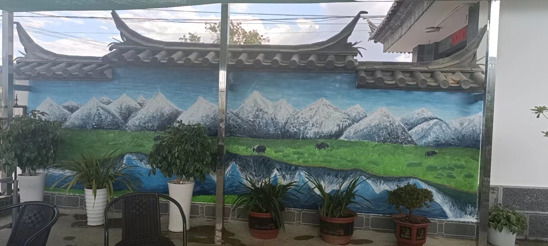 人民对美好生活的向往表现在生活的方方面面,美化生活环境就是一个重要的组成部分。此次来到维西,实践团的同学也为当地村民进行了墙绘。墙绘的对象为维西县兰永村一户藏族村民。同学们经过多次与主人交流沟通并多次修订方案,最终确定了绘墙主题为“雪山倒影”。绘画过程中,主人多次与同学们进行深度交流,修改墙绘中的各种细节,文艺+”实践团队墙绘组的同学经过长达八小时的绘画,于当天晚17点整完成了墙绘工作。同学们的墙绘作品也获得了村民的高度认可。据悉,维西当地的扶贫力度极大,扶贫政策也极其到位。现在村里家家户户将外墙粉刷好,后期准备进行统一的民俗墙绘,形成具有民俗特色的社会主义新型乡村。
