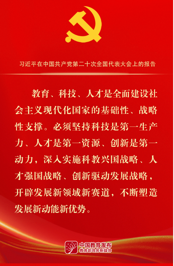 党的二十大报告,紧紧围绕为全面建设社会主义现代化国家、全面推进中华民族伟大复兴而团结奋斗这个宏伟目标,顺应时代潮流,回应人民向往,发出了新时代的政治宣言,为党和国家事业发展以及我们各项工作提供了全新的行动纲领和根本遵循。总书记在报告中特别指出:“实施科教兴国战略,强化现代化建设人才支撑”,使我深受鼓舞、倍感振奋。作为教育系统领导干部,首先要提高政治站位,从讲政治的高度深入学习报告精神,为党育人、为国育才,服务国家、服务人民。要认真抓好贯彻落实,深刻理解认自身肩负的使命责任,全面贯彻党的教育方针,始终忠诚于党和人民的教育事业,创新工作方法,落实好各项工作任务,切实把思想和行动统一到党的二十大精神上来。
