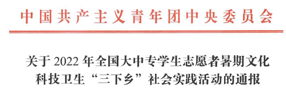 近日,经共青团中央通报公示,2022年全国大中专学生志愿者暑期文化科技卫生“三下乡”社会实践活动,经学校申报、团省委审核推荐、组织评议等环节,我校团委荣获2022年全国大中专学生志愿者暑期文化科技卫生“三下乡”社会实践活动优秀单位。