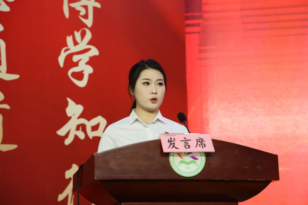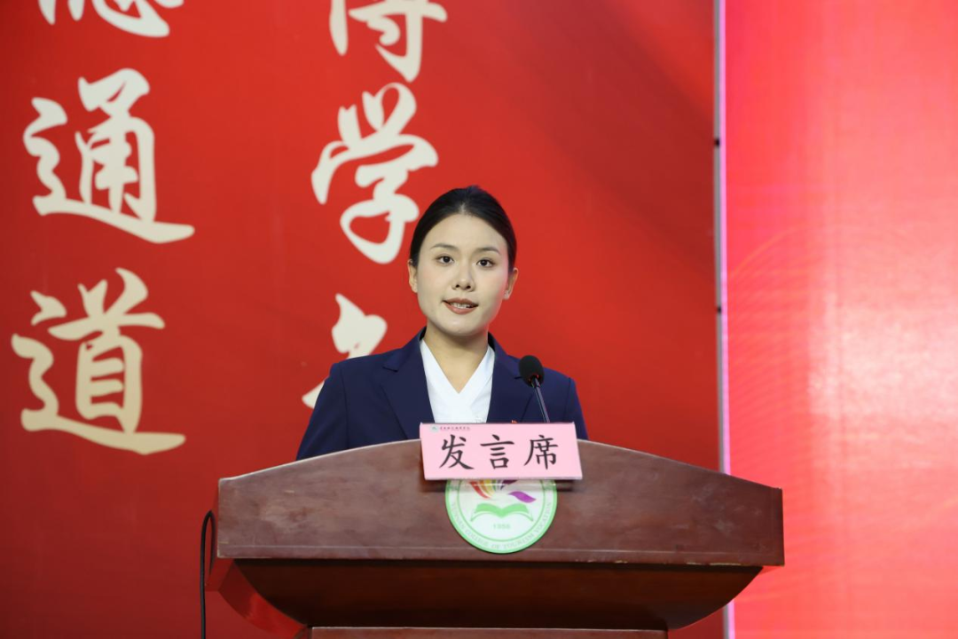 全国第二届乡村振兴职业技能大赛学生组银牌获得者、云南青年讲师团成员、酒店管理学院学生矣金莉作为先进典型代表上台发言。她以“用技能扎根本土,以青春奉献家国”为主题,分享了自己从赛场到行业前沿的奋斗故事,展现了旅院学子“厚德通道,博学知行”的精神风貌。