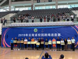2019年5月25日-26日,由云南省教育厅主办、云南省学生体育协会和昆明学院承办,共设小学组、初中组、高中组、中职组、高职院校组、高校组6个组别,分(单人/多人)30秒单摇跳、30秒双摇跳、1分钟跳、30秒交互绳速度跳及接力跳、长绳集体跳等11个项目,200轮次、1568场分2天进行。我校代表队参加了本届跳绳速度赛11个大项的比赛,共斩获包括团体集体项目、单项等奖项共计25项,并获得高职院校组优秀组织奖